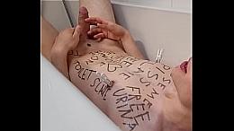 Teenage slave with bodywriting peeing all-over himself